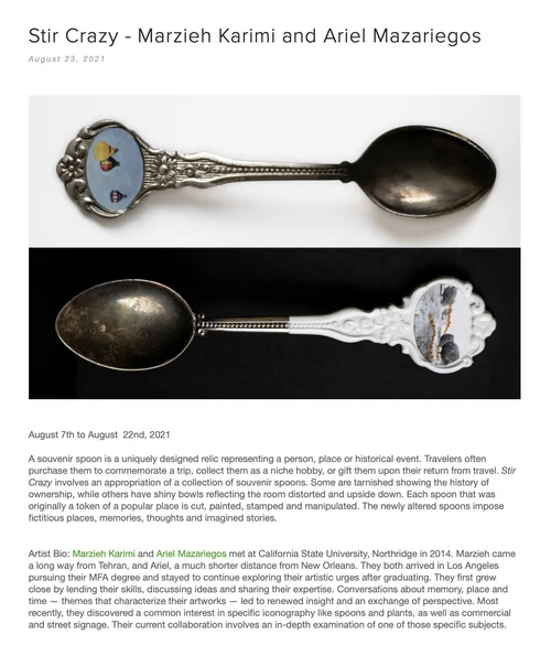 A souvenir spoon is a uniquely designed relic representing a person, place or historical event. Travelers often purchase them to commemorate a trip, collect them as a niche hobby, or gift them upon their return from travel. Stir Crazy involves an appropriation of a collection of souvenir spoons. Some are tarnished showing the history of ownership, while others have shiny bowls reflecting the room distorted and upside down. Each spoon that was originally a token of a popular place is cut, painted, stamped and manipulated. The newly altered spoons impose fictitious places, memories, thoughts and imagined stories.
